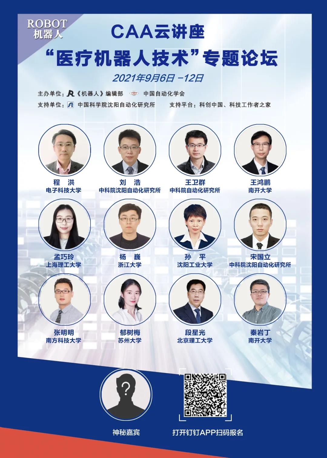 2021年《机器人》编辑部在主办单位中国自动化学会和中国科学院沈阳自动化研究所的大力支持下组织了“医疗机器人技术”专题在线论坛,并将于9月6日正式开播。本次专题在线论坛我们邀请了“医疗机器人技术”专刊12位发文作者作报告,以下是日程安排,请先收好,欢迎关注《机器人》编辑部在线论坛系列活动。